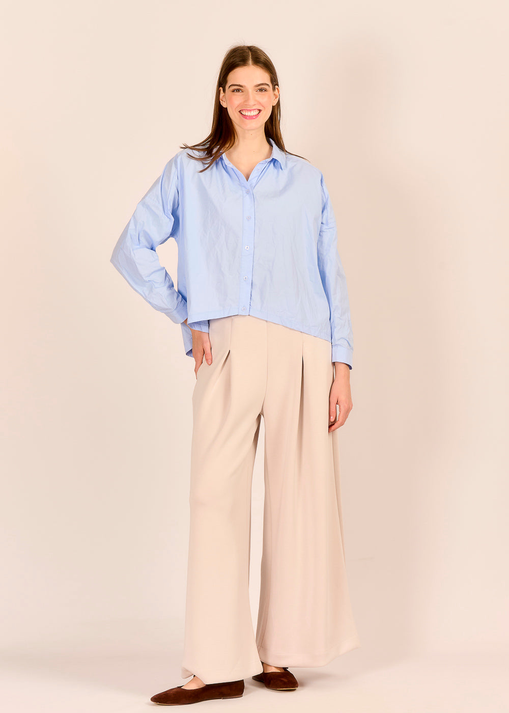 Die modische Hose in elegantem Beige vereint Komfort und italienische Raffinesse. Der fließende Stoff aus Viskose und Modal sorgt für ein bequemes Tragegefühl. Die weite, feminine Silhouette mit den drapierten Falten zaubert mühelos einen stilbewussten Look.