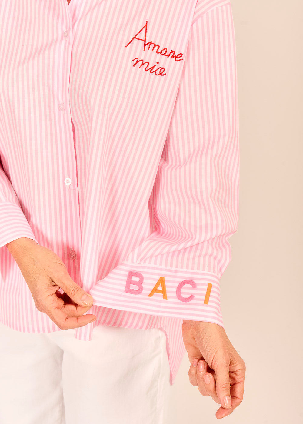 Die gestreifte Bluse ist ein echter Hingucker für verspielte, feminine Sommerlooks. Mit den aufgestickten Worten „Baci“ und „Amore mio“ trägt dieser Look eine kleine Liebesbotschaft aus Italien in sich. Der verlängerte Rückenteil verleiht der Bluse eine moderne Silhouette.