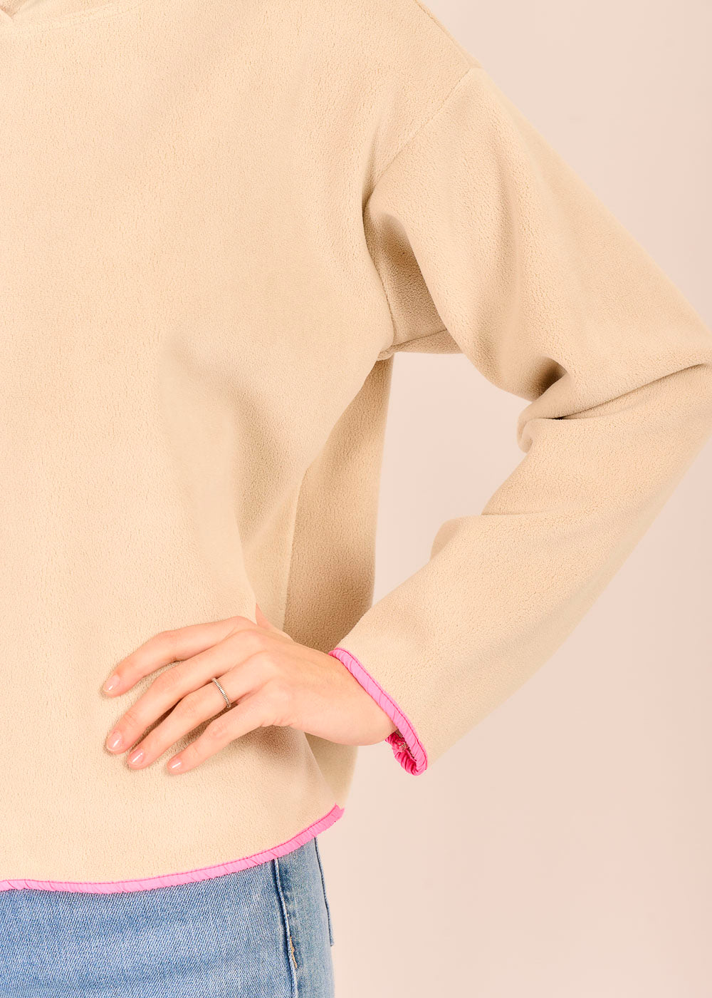 Raffiniertes Farbspiel: Der Fleece-Hoodie aus Viskose wird durch farblichen Kontrast an Kapuze und Saum zum echtem Blickfang. Die sanfte Grundfarbe trifft auf mutige Akzente und strahlt Ruhe und Energie zugleich aus – perfekt für deinen Freizeitlook.